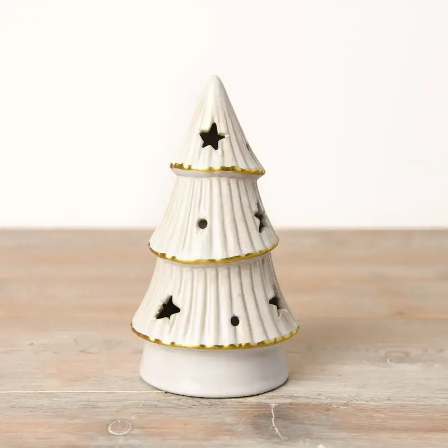 An elegant LED tree with a natural white glaze, gold trim and star cut outs. Perfect for bringing a warm glow into the home at Christmas. This item has been hand finished with care meaning each object is unique with its own individual imperfections. A truly one-of-a-kind piece with a rustic aesthetic. Height approximately 16cm.